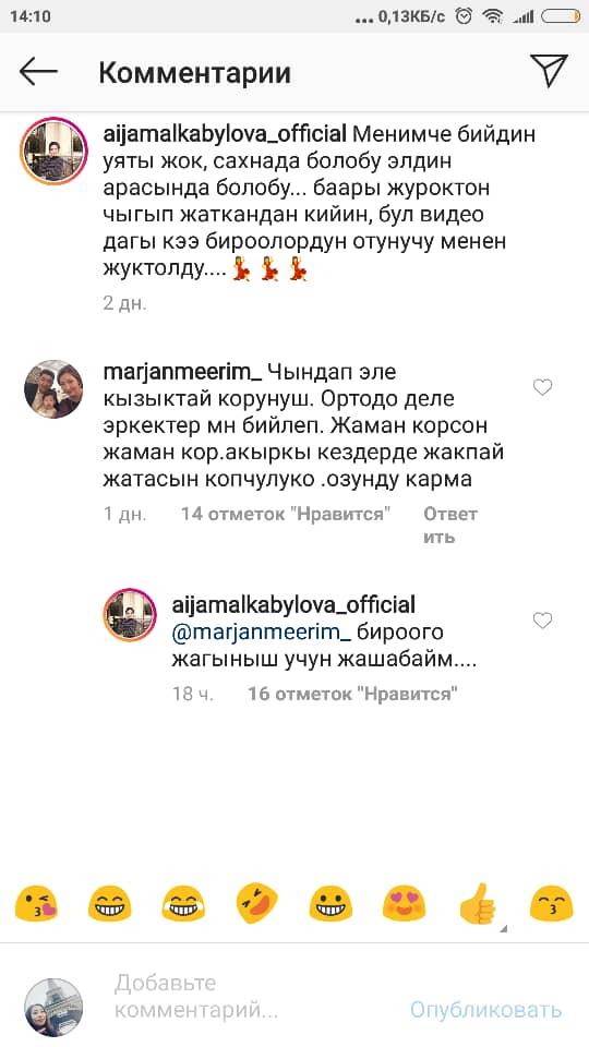 "Менимче бийдин уяты жок, сахнада болобу, элдин арасында болобу баары жүрөктөн чыгып жаткандан кийин бул видео бирөөлөрдүн өтүнүчү менен жүктөлдү"-деп жазган. Бирок, ырчынын күйөрмандары ашыкча шалактап бийлеп кеттиң, жарашпай калат экен, мурда баалачу элем, акыркы күндөрү жакпай баратасың"-деп билдирүү калтыргандар көп болду. Ырчы айым ар бир билдирүү калтырган күйөрманына жооп берип, "Мен эмне кылышты эч кимден сурабайм, ар ким өзүнүн жумушун билсин!"-деп кескин түрдө жооп жазды.