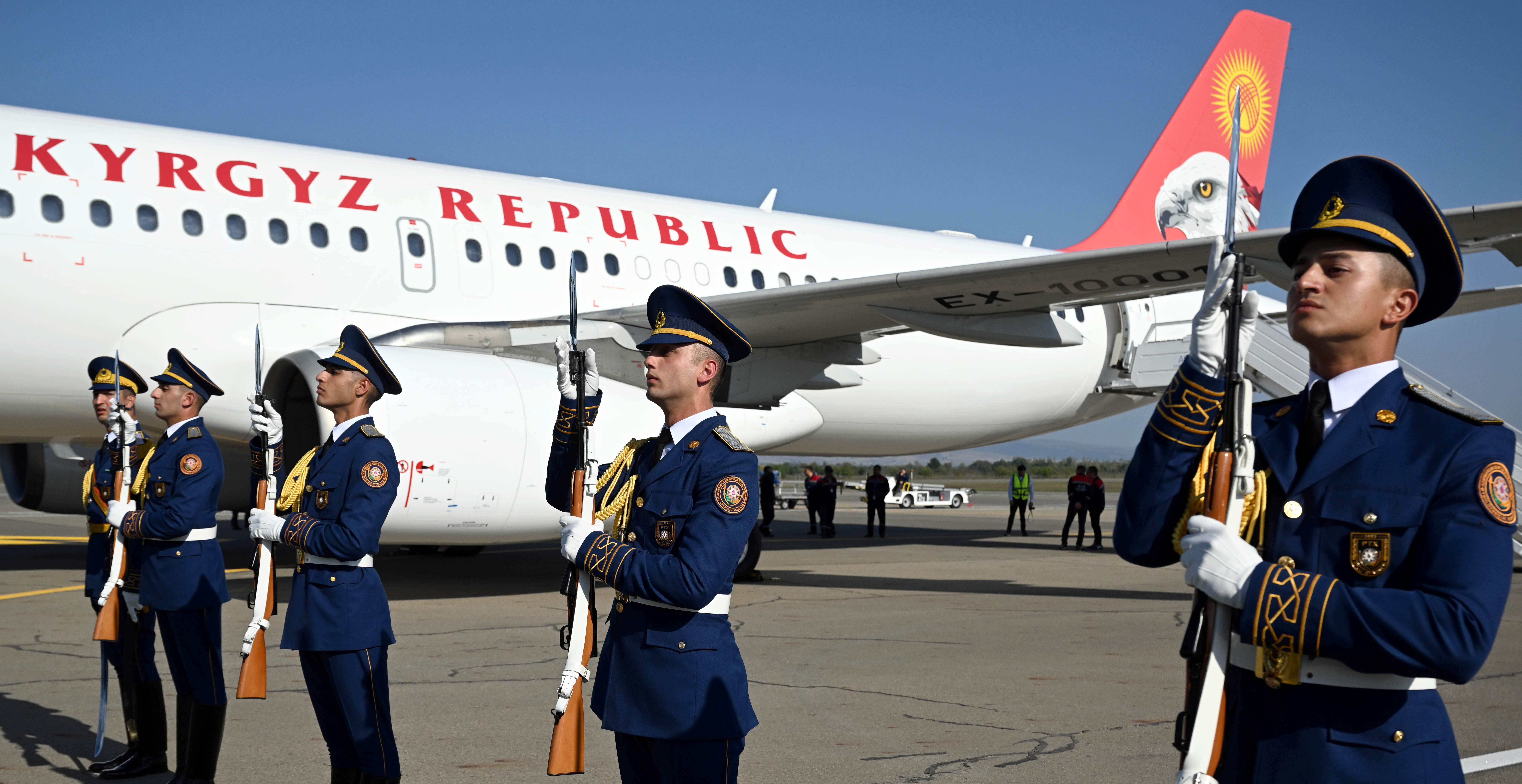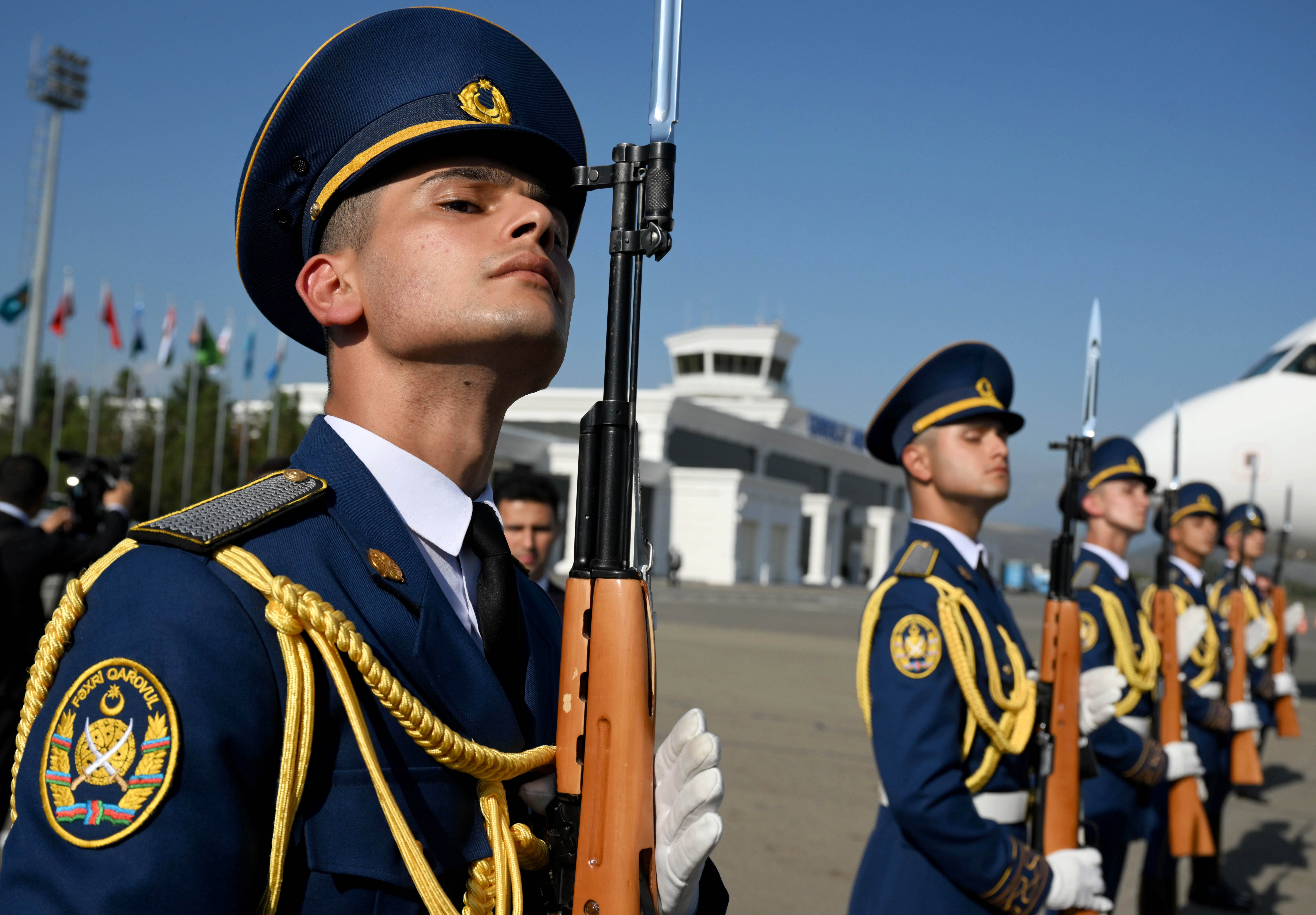 В аэропорту вывешены государственные флаги стран-членов ОТГ, расстелена ковровая дорожка, выстроен почетный караул.