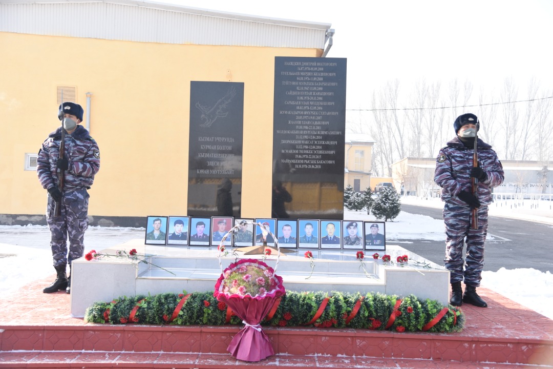 Далее состоялось возложение цветов к Мемориалу славы ПСН «Шумкар» МВД КР, присутствовавшие ветераны МВД, бойцы ОСО, родственники милиционеров почтили минутой молчания память погибших сотрудников.