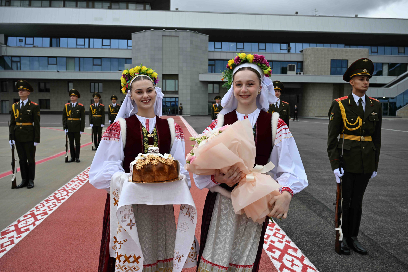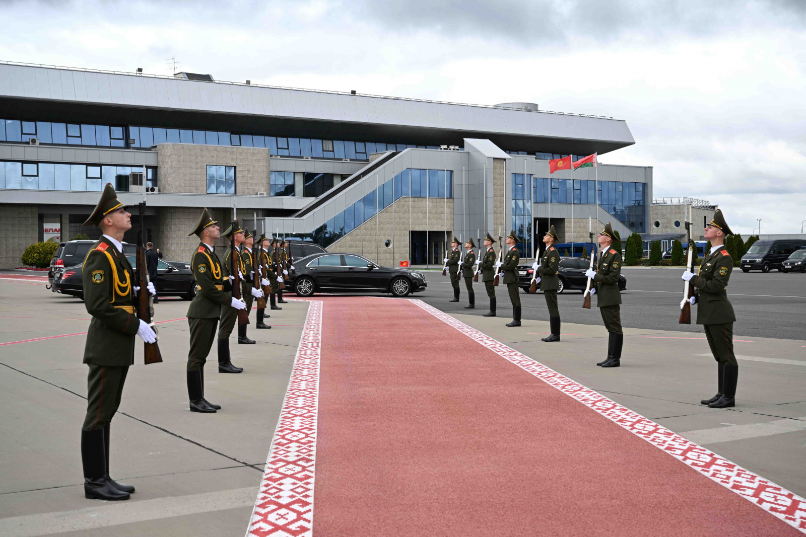 В аэропорту были вывешены флаги двух государств, выстроена рота почетного караула.