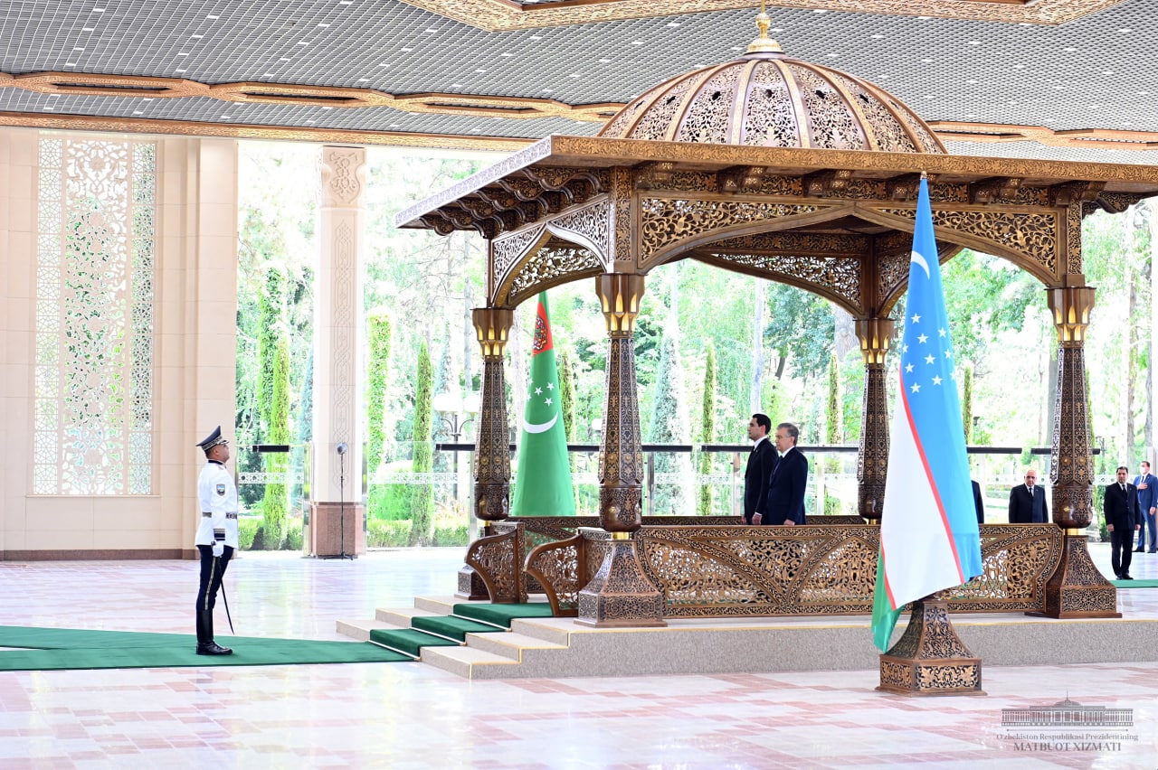 Шавкат Мирзиёев и Сердар Бердымухамедов поднялись на специальный подиум. Прозвучали государственные гимны двух стран.