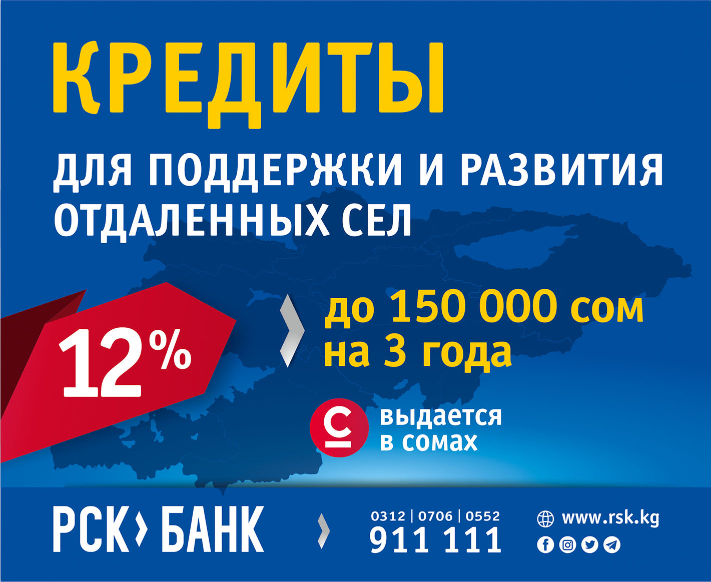 2018 год объявлен Годом развития регионов. «РСК Банк» не остался в стороне и запустил новый кредитный продукт «Поддержка и развитие отдаленных сел». Жители регионов могут получить до 150 тысяч сомов на руки на 3 года без залога под 12 % годовых.