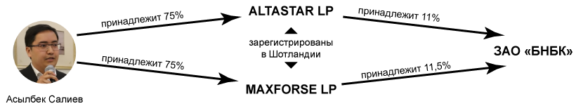 В свою очередь Altastar LP принадлежит 11 %, а Maxforse LP — 11,5 % в ЗАО «Белорусская национальная биотехнологическая корпорация». Таким образом, через шотландские офшоры Асылбек Салиев контролирует 22,5 % в БНБК.