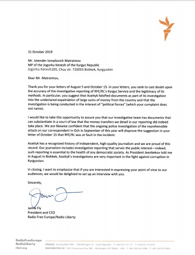 Исходя из этого мы, представители Райымбека Матраимова, требуем, чтобы "Азаттык" предоставил общественности результаты их обращения в американский суд. Кроме того, просим принять на обозрение ответ турецкого банка и явиться в суд с извинениями. Или открыто признать, что в поиске сенсации ими были опубликованы фейковые документы и с помощью их они обеспечили связь с Райымбеком Матраимовым".
