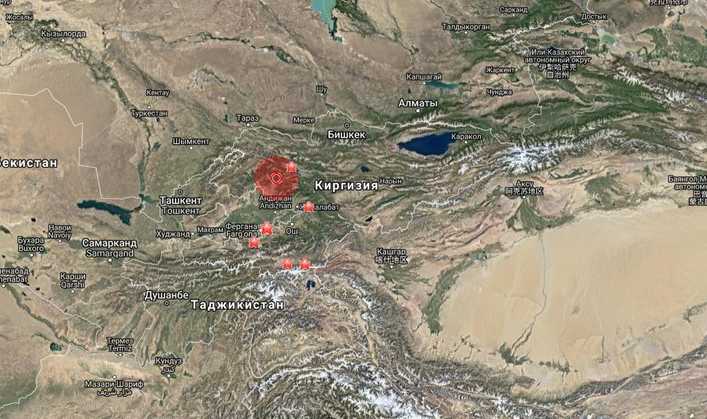 Как уточняется, очаг землетрясения располагался на глубине 17 км на территории Кыргызстана. В частности, в 7 км к востоку от села Райкомол и к северо-востоку от села Кечуу, а также в 17 км к юго-западу от села Ит-Сай.