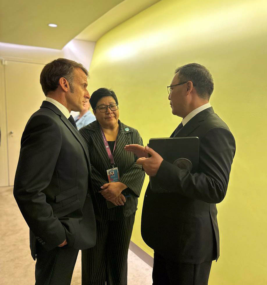 Здесь же представилась возможность обменяться мнениями Садыру Жапарову с президентом Франции Эмануэлем Макроном.